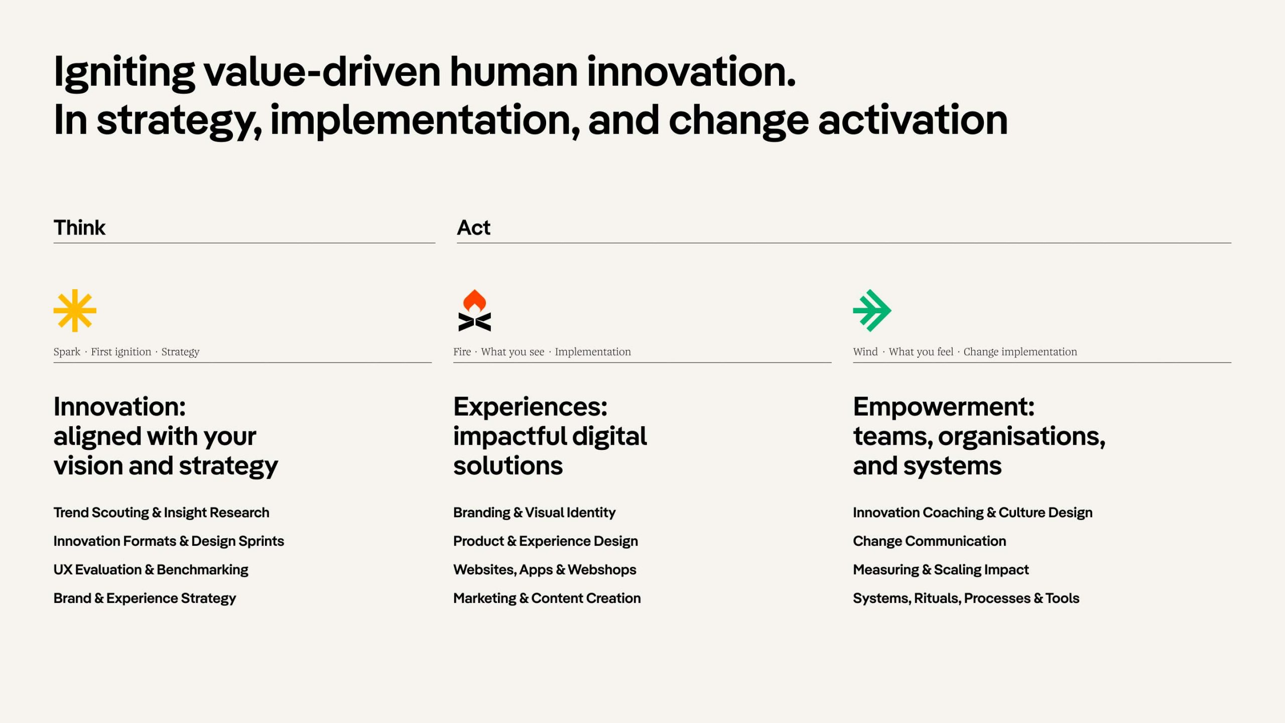 Dazu gehören Trend‑Scouting, Human‑Centered Design, Markenentwicklung, kulturelle Transformation – und mehr.